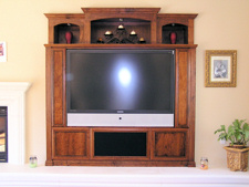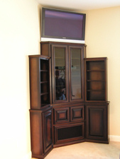 have an audio specialist, we can recommend one. We have fit many extra large televisions into very small alcoves. Also, we can use speaker cloth as cabinet backing to hide speakers and television frames to hide everything but the screen. Large vertical pull-outs can be used as excellent storage. Click on the links below to view many of the options. |